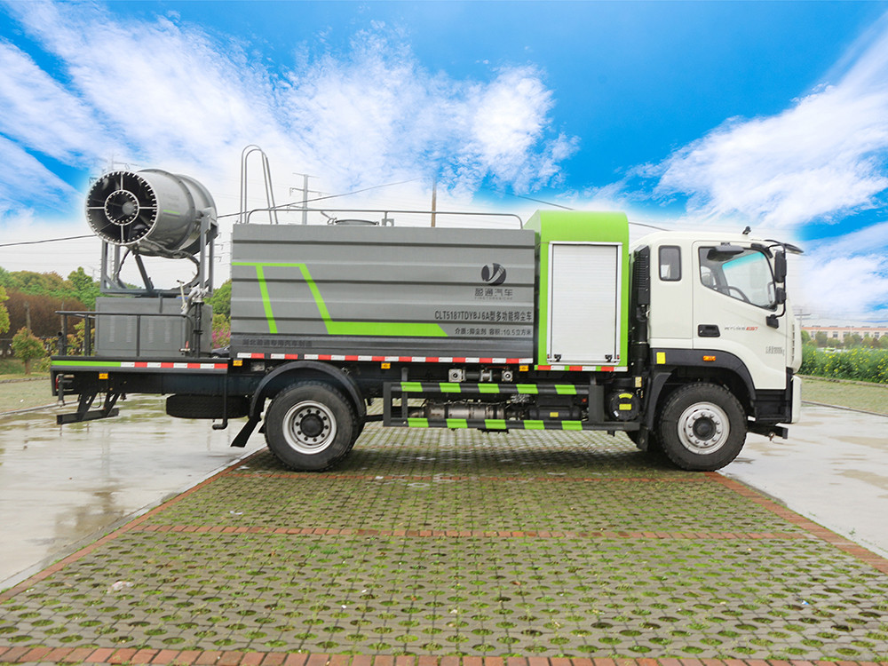 三.產品主要技術參數 序號 名稱 型號、規格 1 整車型號 CLT5187TDYBJ6A 型多功能抑塵車 2 發動機型號 YCS06245-60 3 發動機馬力/功率 玉柴 245 馬力/180KW 4 發動機排量 6234ML 5 變速箱 法士特 8 檔(帶高低檔) 6 輪胎規格 10.00 鋼絲胎 7 軸距 4500 8 總質量 18000KG 9 整備質量 9800KG 10 額定載質量 8005KG 11 整車尺寸(長×寬×高) 8.67*2.5*3.8 12 罐體容積 12 方 13 燃料種類 柴油 14 排放標準 國六 15 水泵型號 60/90 16 罐體材質 Q235 碳鋼